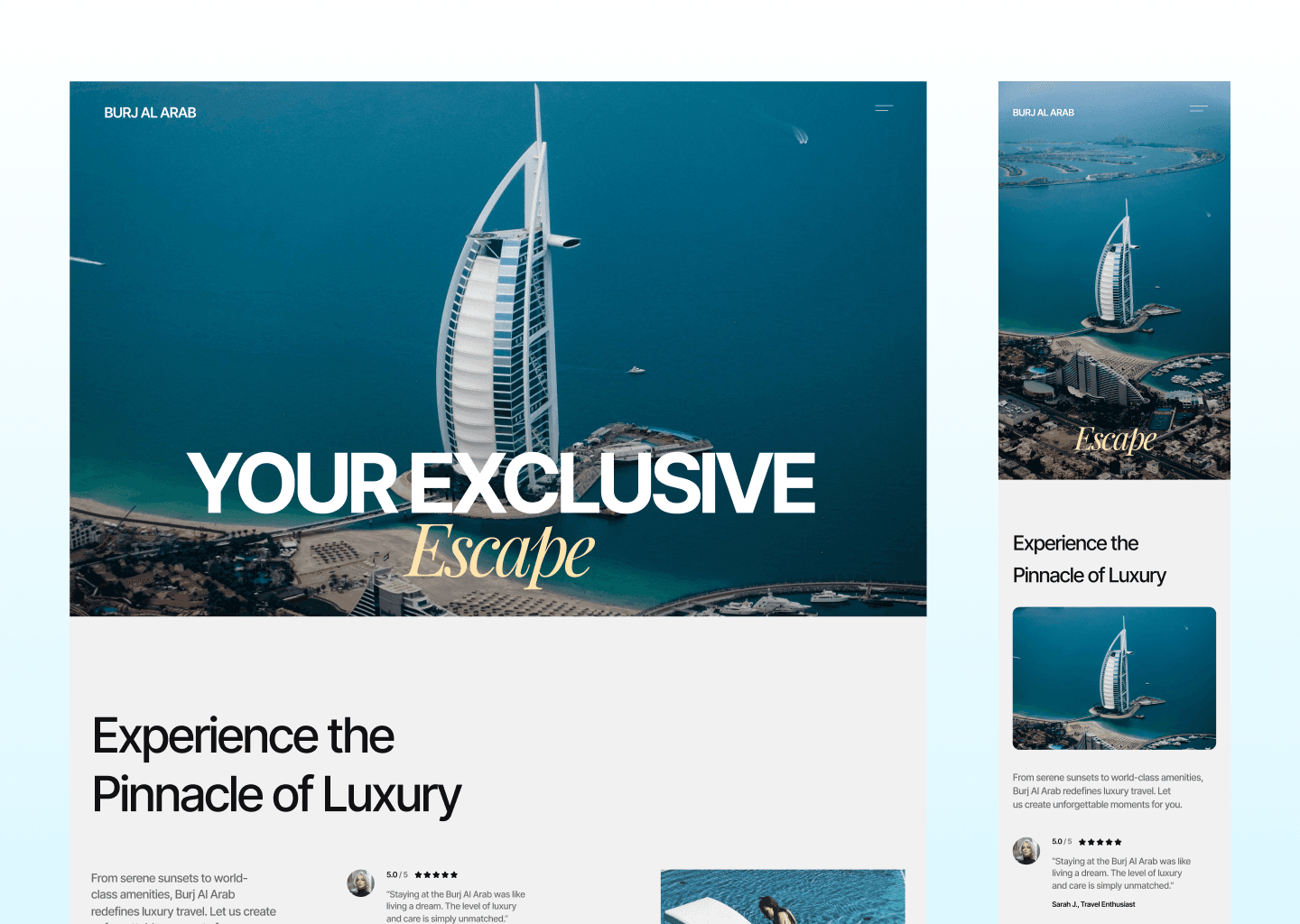 This conceptual design for the iconic Burj Al Arab Jumeirah Resort in Dubai reimagines luxury hospitality through a user-centric website interface. The goal was to capture the brand's essence of timeless elegance, blending opulence with seamless functionality. This project highlights an approach that emphasizes experiential luxury while staying aligned with modern usability trends.